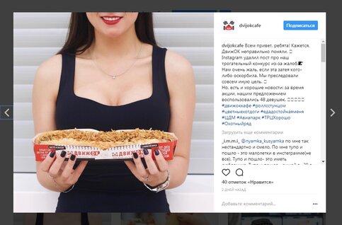 После скандала в соцсетях руководство кафе извинилось перед посетительницами, но скидку пока решило не отменять. "Кажется, нас неправильно поняли. Instagram удалил пост про наш трогательный конкурс из-за жалоб. Нам очень жаль, если эта затея кого-либо оскорбила. Мы преследовали совсем иную цель", – говорится на странице сети в Instagram.