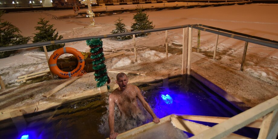 Троица молодых ребят один за другим спускаются в майну в Серебряном Бору. Проплыв пару метров, они окунаются и со смехом вылезают из воды. Спустя пару минут, еще не обсохнув, снова лезут в воду. На улице температура воздуха минус четыре градуса. В воде ненамного теплее – плюс три.
