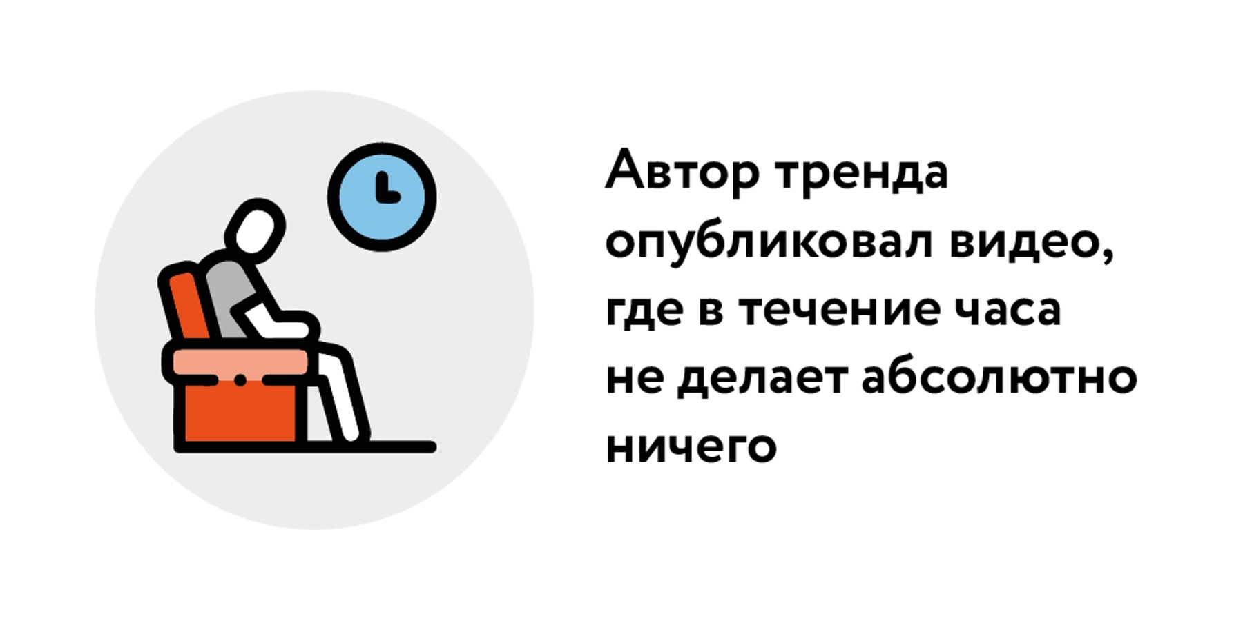 Автором тренда стал мужчина по имени Роуэн, который опубликовал видео, где он в течение часа не делает абсолютно ничего. Свой эксперимент молодой человек ускорил и выложил в формате 30-секундного ролика. В комментариях многие признавались, что не смогли досмотреть даже это видео до конца – настолько им было сложно концентрироваться. При этом другие пользователи шутили, что Роуэн "открыл для себя медитацию".