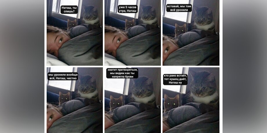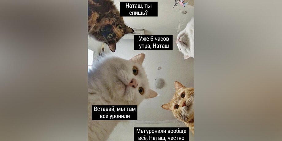Мем "Наташ, ты спишь? Наташ, вставай, мы там все уронили" появился в одном из пабликов соцсетей в 2019 году. Сначала на фото было только два кота и девушка под одеялом. Коты будили хозяйку и требовали их накормить. Настоящий бум мем пережил весной 2020 года, когда его стали использовать для шуток про обвал рубля, локдауны в период коронавируса и в качестве картинки к любым событиям и эмоциональным переживаниям в связи с пандемией.