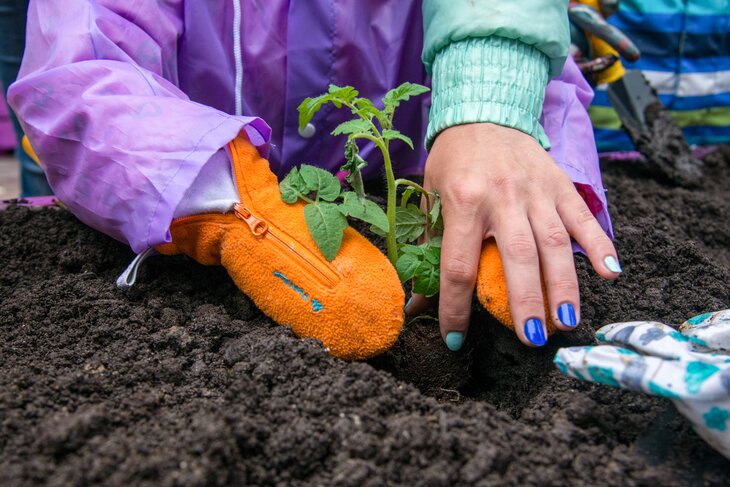 После выдачи инвентаря куратор проекта агроном Ольга Лопатина начала объяснять маленьким садовникам, как правильно высаживать рассаду в грунт, делать лунки и утрамбовывать землю вокруг куста. Около своих посадок дети ставили именные флажки.