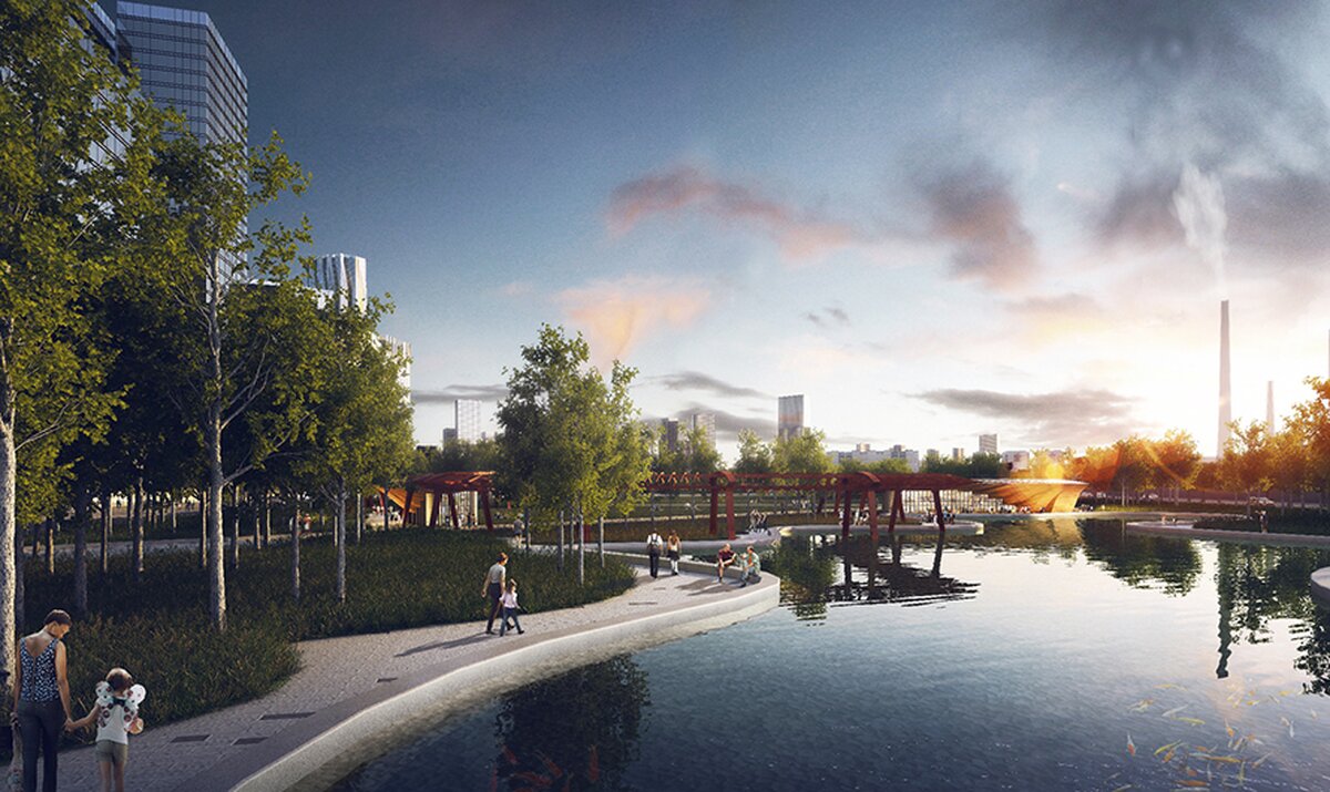 Также в парке появится похожий на речку пруд, вдоль которого проложат пешеходные дорожки и веломаршруты.