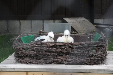Пара черных аистов приносит потомство второй год подряд. Сейчас птенцам уже месяц. Они останутся на попечении сотрудников зоопарка, пока не станут достаточно самостоятельными.