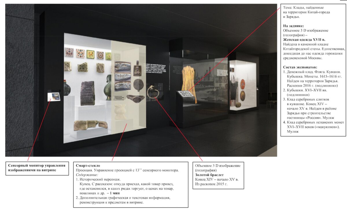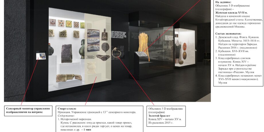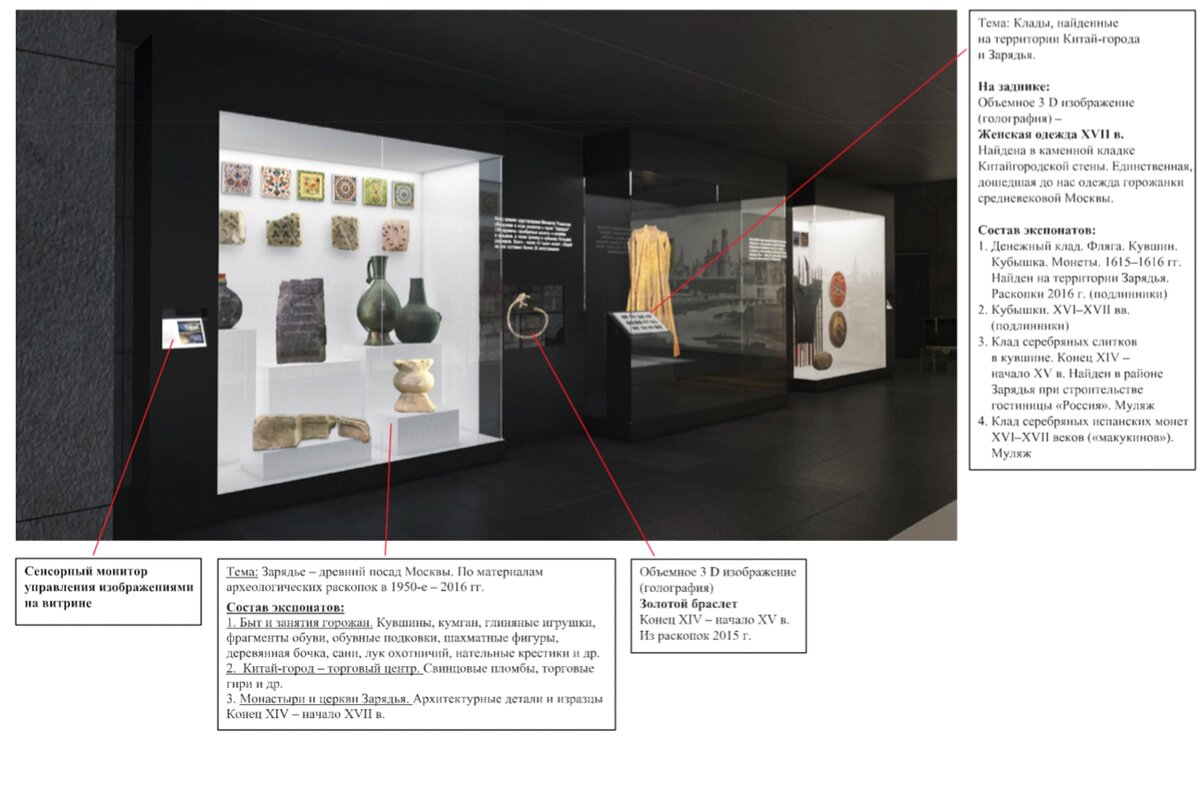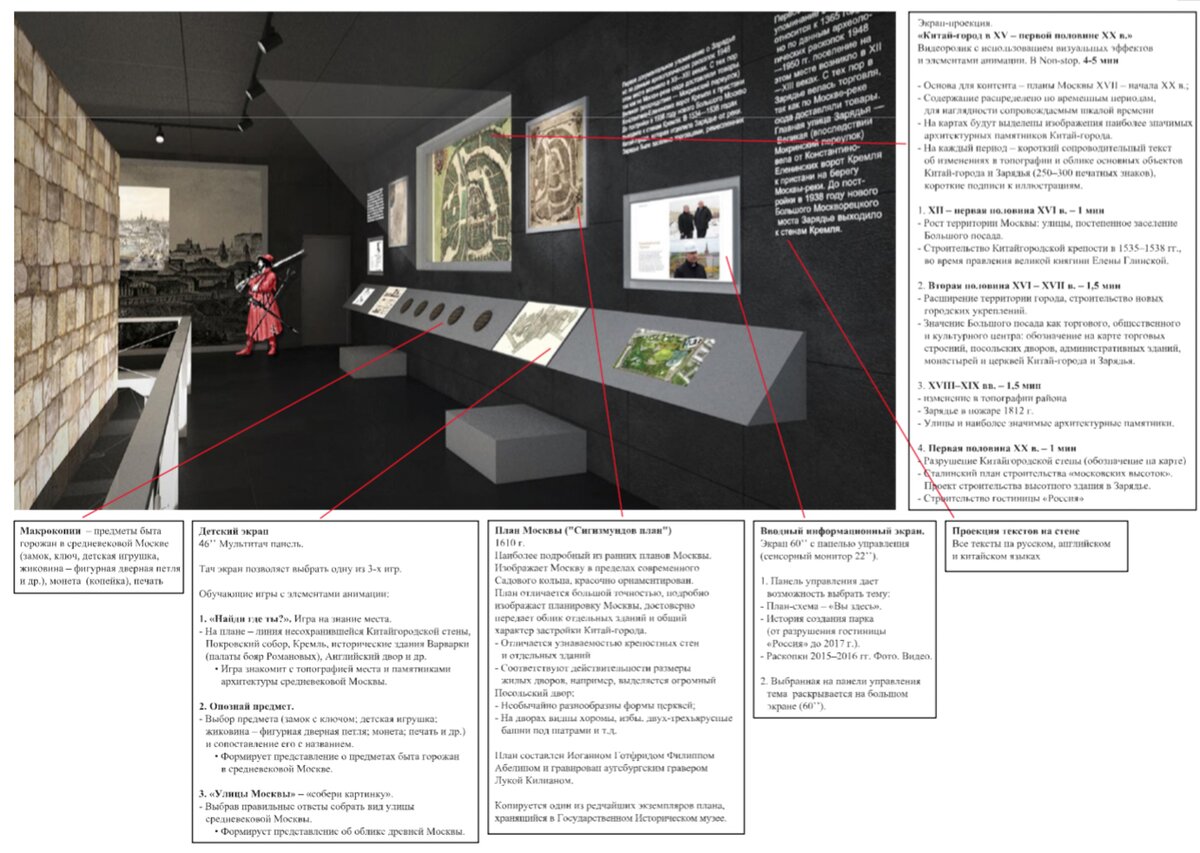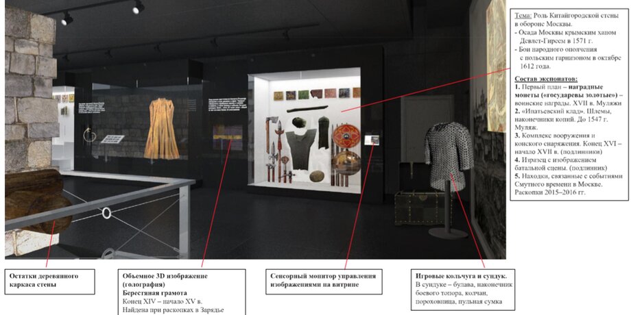 Главным экспонатом музея станет фрагмент Китайгородской стены. Москвичам расскажут о быте, средствах передвижения, одежде и культуре средневековых жителей города. Экспозиция также включит в себя археологические находки, найденные во время строительства Зарядья. Помимо этого, в музее установят интерактивные экраны "История Зарядья", "Китайгородская крепость – памятник фортификационного искусства XVI века" и "Викторина".