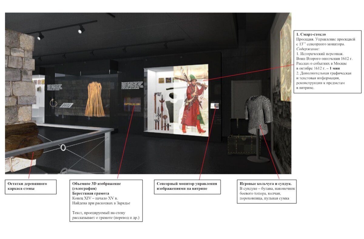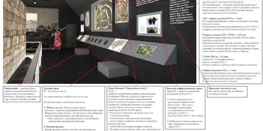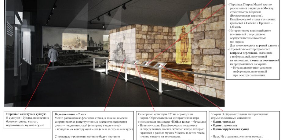 Кроме того, будет работать экран "Крепость", где можно построить крепость, расставить воинов и пострелять из пушки. Также посетители смогут на интерактивных экранах найти клад в "Зарядье", одеть исторического персонажа. Отдельно расскажут об истории Китай-города и жизни в нем с помощью проекций. Проекционная инсталляция Петрок Малый кратко расскажет о приезде в Москву, строительстве в Кремле (Воскресенская церковь), Китайгородской стены и земляных крепостей в Себеже и Пронске. В музее также будет детская игровая комната. Подземный музей планируют открыть к сентябрю 2017 года.