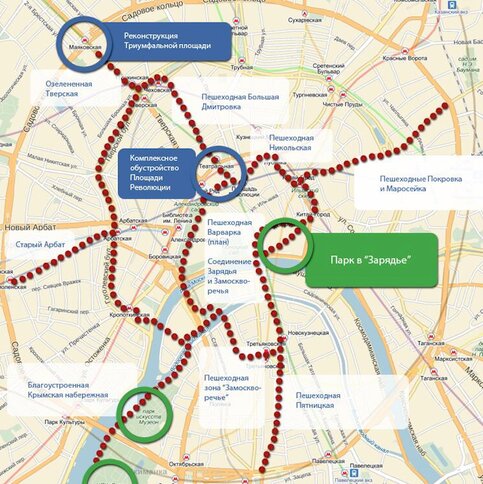 Также планируется улучшить пешеходную доступность Пушкинской площади, Якиманской набережной, улиц Пречистенка, Остоженка и Моховая. Кроме того, еще один маршрут может появиться в Северном округе возле метро "Сокол".