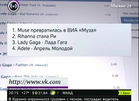 Так, группа Muse с легкой руки незаконопослушных меломанов превратилась в ВИА "Муза", певица Rihanna на сайте зовется Ри, Lady Gaga переименовали в Ладу Гага, а британская звезда Адель - в Апрель Молодой.