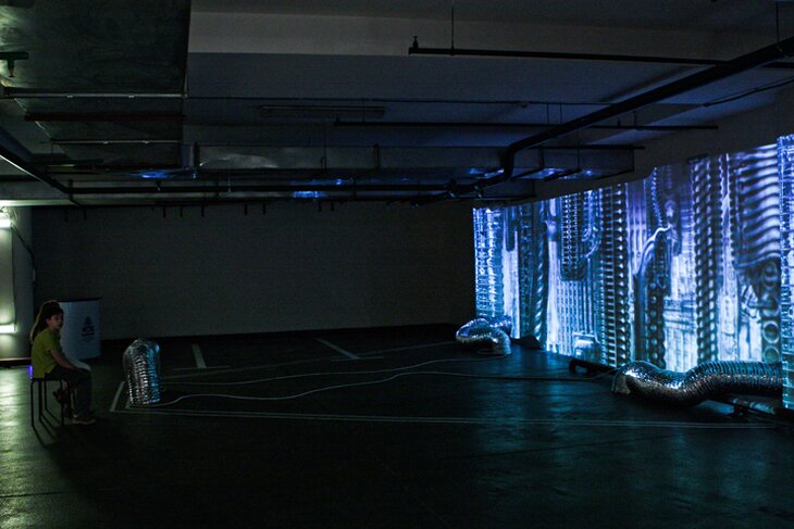 Подземная парковка с вынесенными наружу коммуникациями — замечательное место, чтобы оценить индустриальный арт Гигера