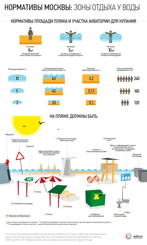 На московских пляжах обустроят зоны для купания детей и людей, которые не умеют плавать. Об этом ранее заявлял начальник Московской городской поисково-спасательной службы на водных объектах Василий Марьян. "Располагаться она (площадка) будет не дальше 15 метров от береговой линии, а далее иметь плавное понижение от 1,2 до двух метров глубины. Далее уже будут буйки", – говорил он. Василий Марьян подчеркнул, что водному транспорту запрещено приближаться к специальным зонам на расстояние ближе 50 метров.