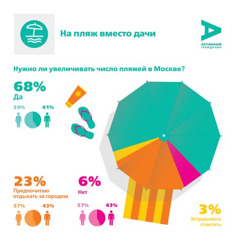 Порядка 23 процентов проголосовавших остались равнодушны к новым пляжам, отметив, что предпочитают проводить свободное время за городом. Так проголосовало большинство участников из ЗелАО, СВАО и ЮЗАО. Этот вариант ответа был также популярен у жителей столицы в возрасте от 35 лет и старше.