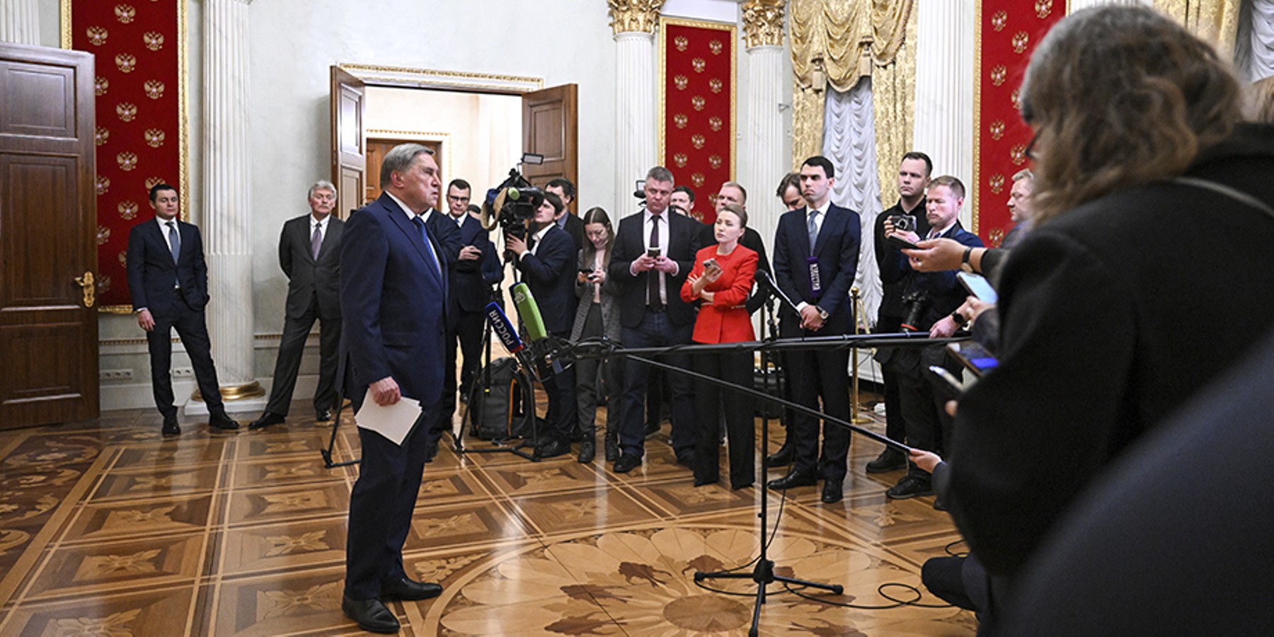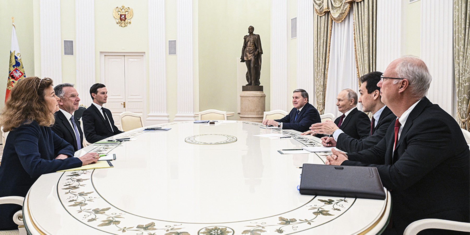 После этого Уиткофф и Кушнер отправились в Кремль для переговоров с Владимиром Путиным по вопросам достижения долгосрочного мира на Украине. С российской стороны в беседе также участвовали Кирилл Дмитриев и помощник президента РФ Юрий Ушаков.