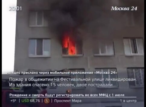 Ранее в ГУ МЧС сообщали, что в 17:48 поступил звонок о пожаре по адресу: улица Фестивальная, дом 4/3. Горела комната на третьем этаже 21-этажного здания общежития на площади 15 квадратных метров.