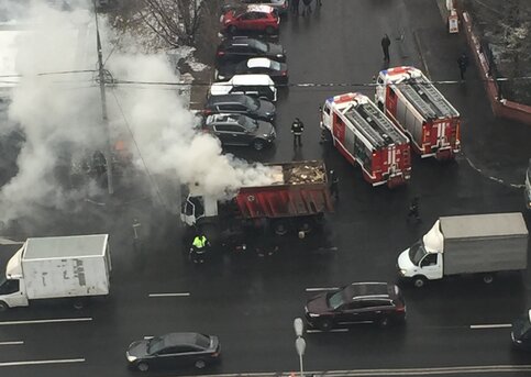 Инцидент произошел около платформы "Трикотажная" в районе дома № 97 на Волоколамском шоссе. Загорелся мусор в самосвале фуры.