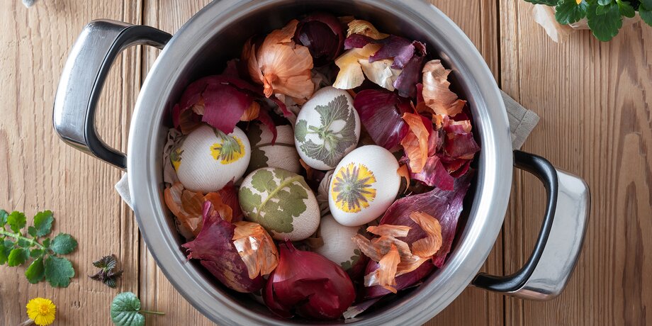 Самый популярный – коричневый цвет. Для него нужно взять некоторое количество луковой шелухи – чем больше, тем лучше – и кипятить в воде в течение часа. Затем окуните яйцо в полученный раствор на несколько минут и любуйтесь результатом.