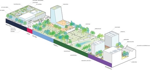 "Две кольцевые дороги можно использовать функционально, для автомобилей и автобусов, а по праздникам и выходным проводить фестивали, марафоны, пробежки, например, забеги ретро-автомобилей. Также можно проложить велодорожки из Коломенского в сторону центра", ― пояснил Тигер. Длина планируемой велотрассы ― 14 км. Предполагается, что внутри "колец" будет промышленные предприятия, справа от них ― офисные здания, далее ― "зеленая зона" и жилые районы. В "зеленой зоне" должны разместиться парки, больницы и предприятия, производящие медицинское оборудование. Площади кластеров в концепции не определены. Все здания будут экологичными ― с зелеными крышами, солнечными батареями и системой сбора дождевой воды.