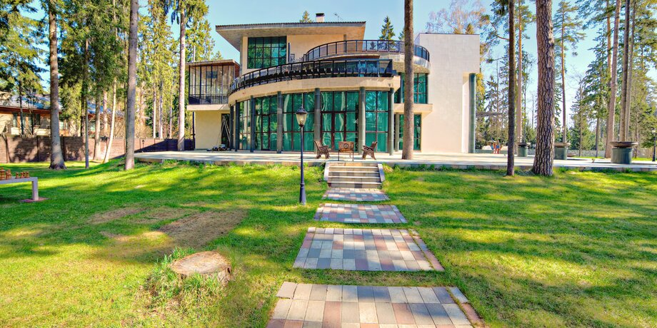 Особняк занимает более двух тысяч квадратных метров на участке площадью два гектара. Строение окружают вековые сосны.