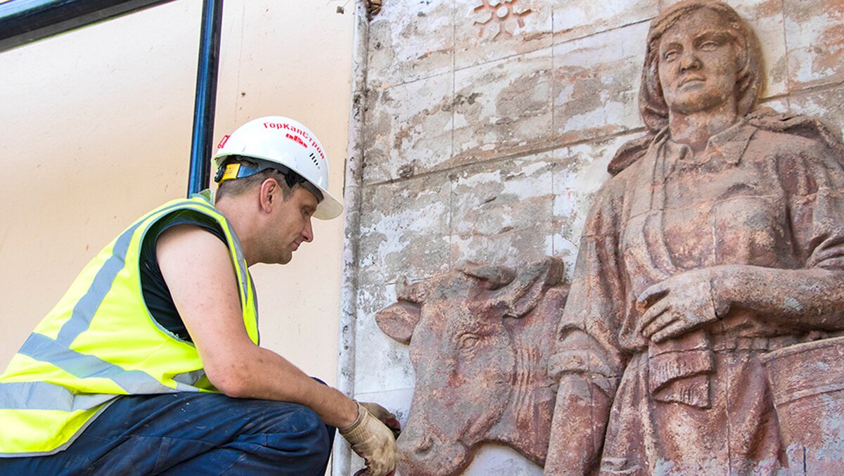 Барельефы с изображением доярки и свинарки обнаружили во время реставрации фасадов павильона № 6 "Химия" на ВДНХ, сообщает портал мэра и правительства Москвы. Ранее скульптурные композиции были скрыты за кирпичной кладкой.