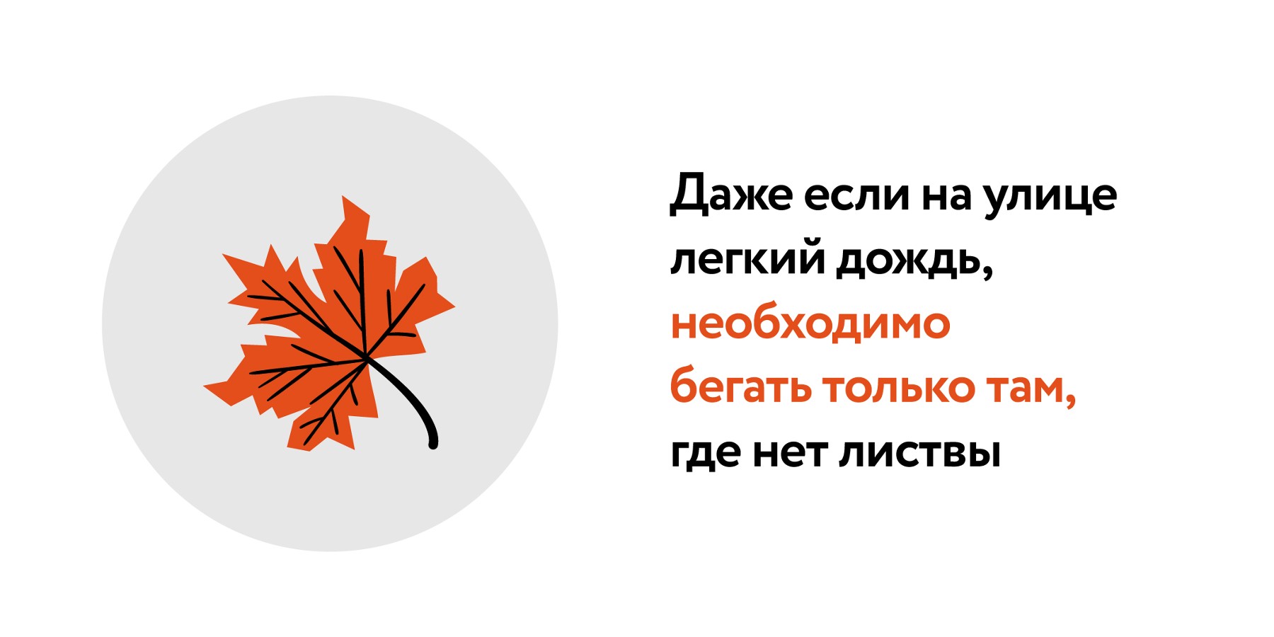 Что я имею в виду? Речь идет о том, что категорически не рекомендуется заниматься (особенно, бегать) под дождем. И вопрос здесь не в том, промокните вы или нет: эта проблема легко решается правильно подобранной одеждой. Опасность кроется в листве, которая обильно покрывает сейчас дороги, тем более в лесопарковой зоне. А мокрая листва – сродни льду: можно легко поскользнуться и получить травму.