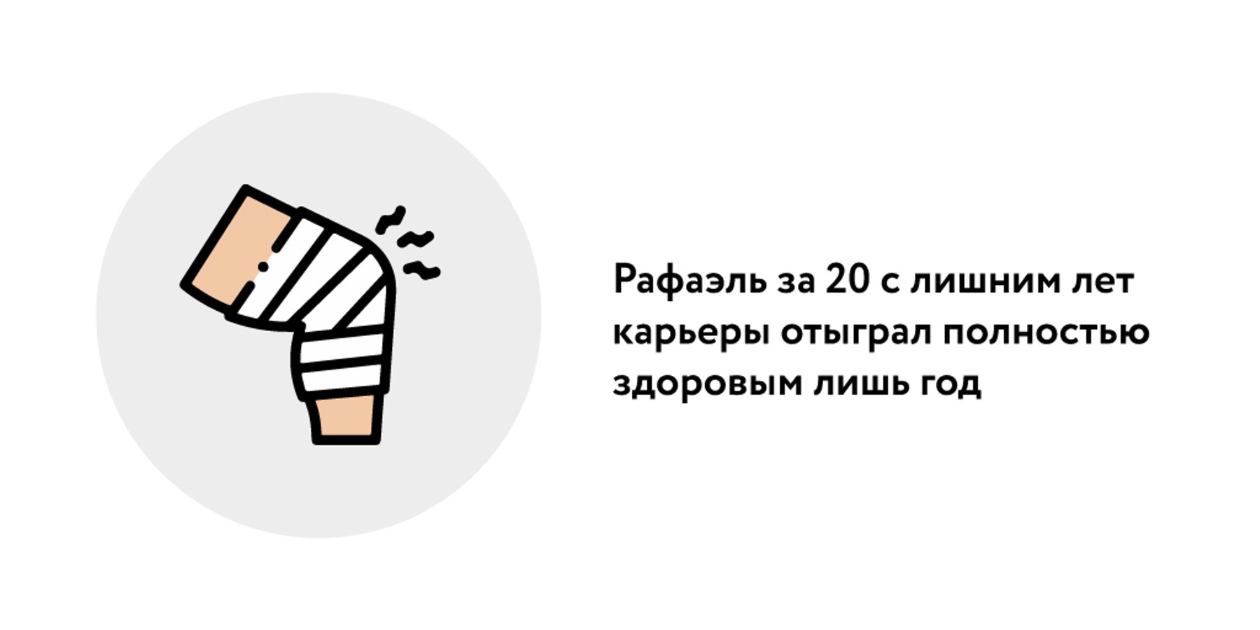 Но ошибочно думать, что травмы преследовали его только в последние годы. На самом деле Рафаэль за 20 с лишним лет карьеры отыграл полностью здоровым лишь год – 2015-й. Причем помимо заработанных травм, его мучали врожденные дефекты. Один из них – болезнь Келлера, из-за которой хронически беспокоила левая стопа. Надаль даже хотел закончить с теннисом в 2005-м, но решил идти дальше.