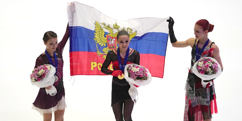 Слева направо: Анна Щербакова (Россия), завоевавшая серебряную медаль, Камила Валиева (Россия), завоевавшая золотую медаль, Александра Трусова (Россия), завоевавшая бронзовую медаль в женском одиночном катании на чемпионате Европы в Таллине, на церемонии награждения. Фото: РИА Новости/Александр Вильф