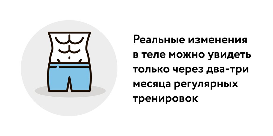 Лучше заранее понять, что быстрых результатов не бывает. Реальные изменения вы увидите через два-три месяца регулярных тренировок, а не через пару недель. Организм должен привыкнуть к новому ритму жизни, в том числе ваши связки, сухожилия и мускулатура. В результате нагрузок также меняются многие процессы в организме, и все это происходит далеко не сразу.