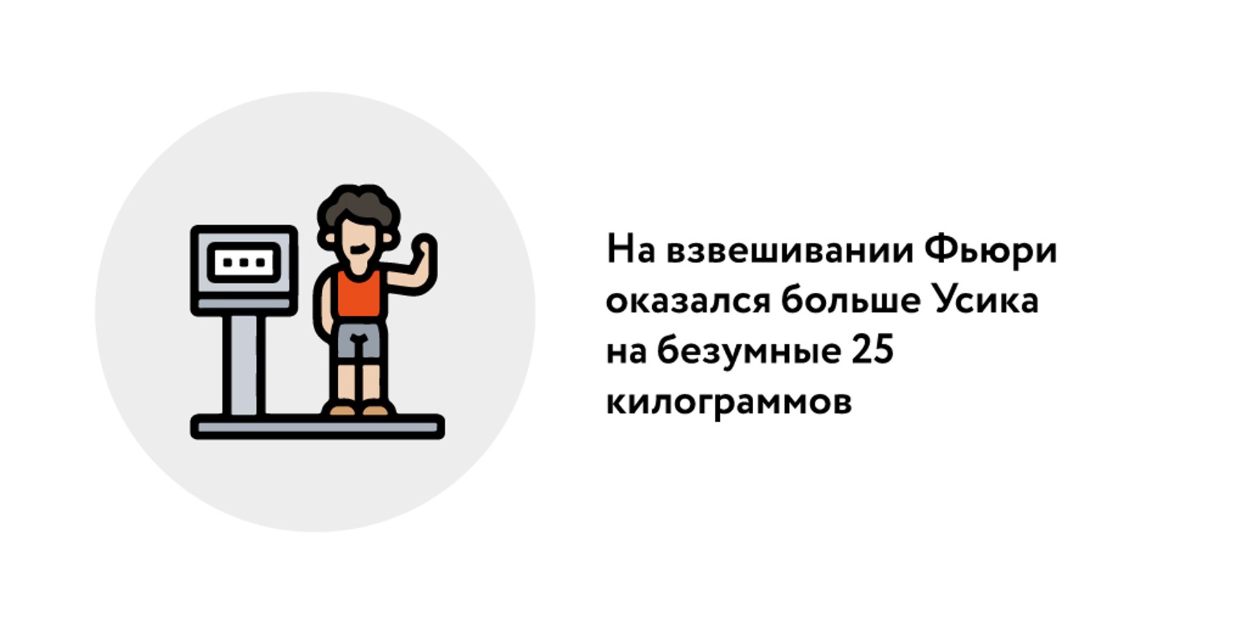 В реванше разыгрывались титулы по версиям WBC, IBO, WBO, WBA (Super) и The Ring. На взвешивании Фьюри оказался больше Усика на безумные 25 килограммов – 127,4 против 102,5. Но команду украинца больше интересовал не вес, а борода соперника: промоутер боксера Александр Красюк потребовал от британца ее сбрить, так как она слишком длинная, что запрещено правилами. Однако у самого Усика претензий не было, поэтому Фьюри появился на ринге с внушительной растительностью на лице.