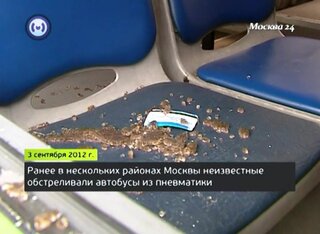 Напомним, обстрелы автобусов в Москве происходят регулярно с начала лета 2012 года. К примеру, 6 сентября два междугородних пассажирских автобуса пострадали от хулиганов на востоке Москвы. 27 августа предположительно пулей из пневматики было повреждено стекло пустого рейсового автобуса в 1-ом Силикатном проезде.