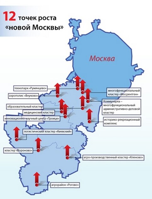 Кроме того, столичные власти намерены сформировать порядка двенадцати социально-деловых кластеров, или точек роста. Основной принцип при градостроительном развитии этих кластеров - это территории вокруг населенных пунктов и близость к транспортным магистралям. В перечень новых точек роста войдут Внуково, Рязаново, Троицк, Ярцево, Киевский, Щапово, Вороново, Кленово, Рогово.