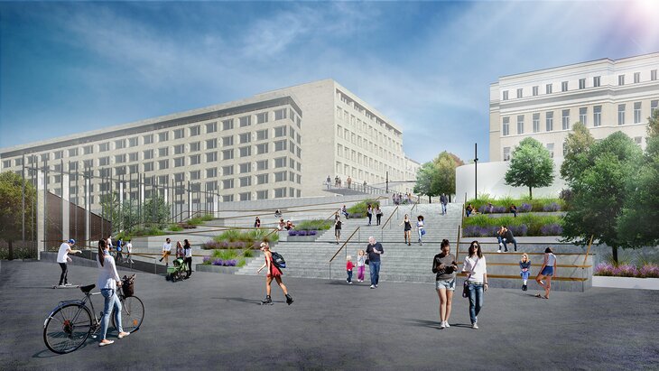 Технический проезд от Ленинского проспекта превратится в пешеходный бульвар. Там обустроят зону крытого навеса и лестницу со смотровой площадкой, которая расположится перед входом в Парк Горького у музея современного искусства "Гараж". По словам Олега Шапиро, новый вход облегчит дорогу тем, кто хочет посетить музейную экспозицию или прогуляться в Нескучном саду.