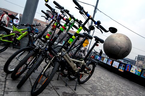 Театральный велозаезд, организатором которого является Благотворительный фонд поддержки деятелей искусства "Артист", проходит в рамках мероприятий, посвященных празднованию Дня города.