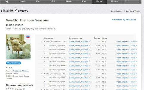 Альбом “Vivaldi: The Four Seasons” молодой голландской скрипачки Янин Янсен заняли первое место в общем чарте российского iTunes.
