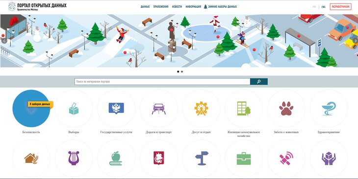 Портал открытых данных – это электронный справочник Москвы, достоверный источник информации по инфраструктуре города. Портал обобщает данные более чем о 315 тысячах городских объектов: учреждениях социальной сферы, объектах досуга и отдыха и многих других. Проект, стартовавший 29 января 2013 года, стал первой подобной площадкой в России.