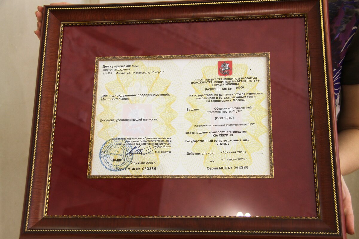 Сергей Собянин вручил 55-тысячное разрешение на таксомоторные перевозки. Лицензию получил генеральный директор компании "ЦПК" Александр Клебанов.