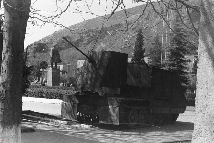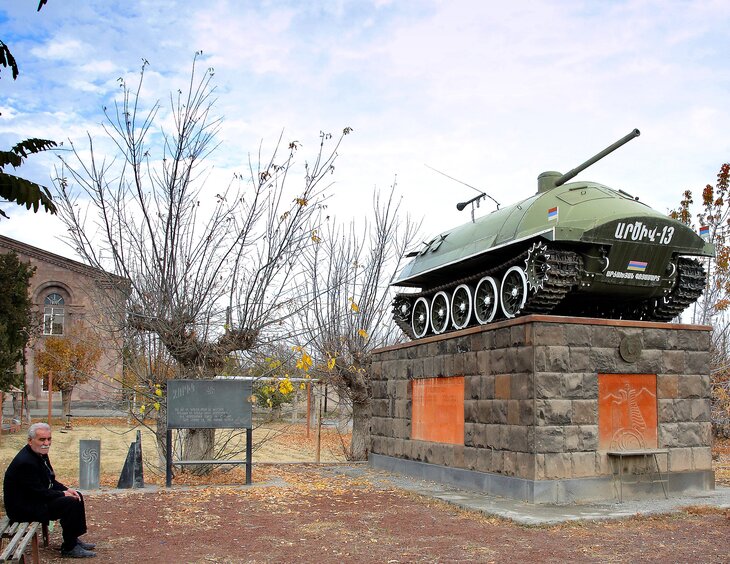 Сделан был этот агрегат уже в 2000-х, по всей вероятности, на базе тягача АТ-Т, участия в боевых действиях не принимал, да и вряд ли когда-то ездил своим ходом. Просто Армения до сих пор очень бедная страна и у нее нет лишних танков, чтобы ставить их на постаменты.