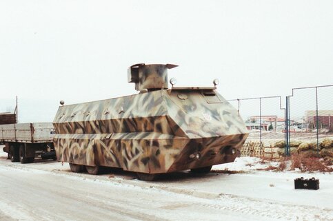 Смотришь – и сразу на ум приходит известная сказка про Емелю и его самоходную печку. Броневик изготовлен рабочими ремонтного завода "Сельхозтехника" в Дубоссарах. По сведениям от лиц более или менее причастных к процессу, в пустоты между бронелистами и корпусом таких машин в качестве средства дополнительного бронирования засыпали песок.