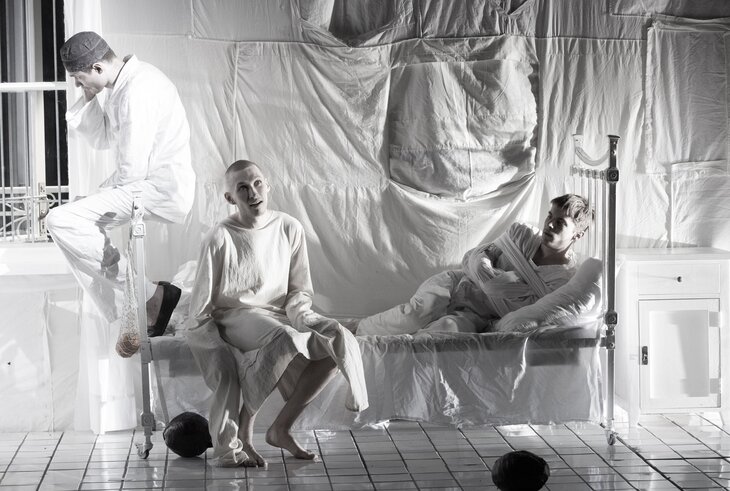 В спектакле Женовача герои самого известного романа Булгакова превратились в пациентов клиники Стравинского. В психушке оказались не только Мастер (Игорь Лизенгевич) и Маргарита (Евгения Громова), но и страдающий мучительными приступами мигрени Понтий Пилат (Дмитрий Липинский), и поэт Иван Бездомный (Иван Янковский), и Иешуа (Александр Суворов).