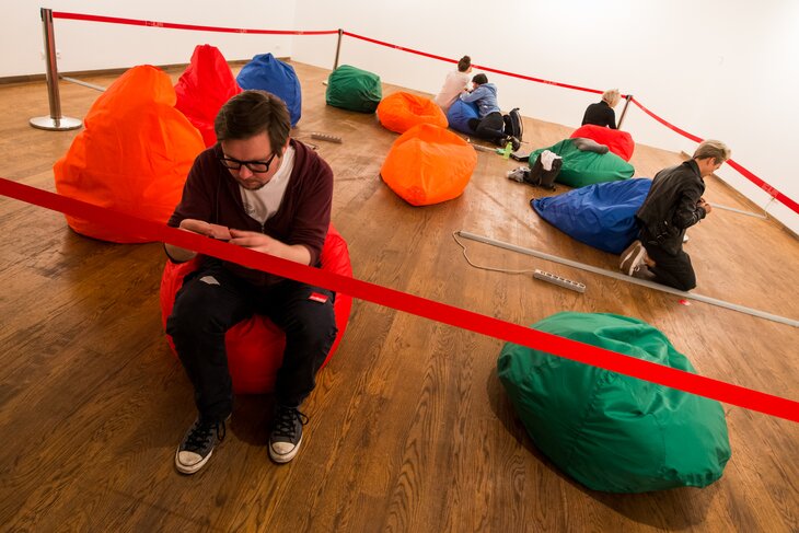 Смотрящий в экран человек – главный экспонат в четвертом зале. По мнению режиссера, это самый яркий представитель повседневности. Здесь по залу разбросаны пуфики, и, что самое главное, есть wi-fi. Зайдя за красное ограждение, каждый зритель сам на некоторое время превратится в экспонат.