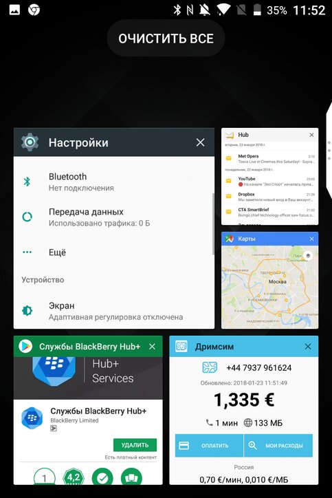 Довольно необычно – в виде плитки – отображаются запущенные приложения. Такое решение перекочевало в графическую оболочку BlackBerry KEYone из операционной системы BalckBerry 10.
