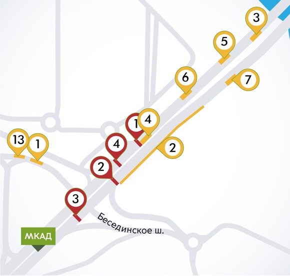 С 1 октября 2018 года по 30 августа 2019 года будут вводить ограничения и перекрытия движения в районе пересечения МКАД и Бесединского шоссе. Сейчас закрыто по одной полосе на двух участках кольцевой автодороги (участок №1 и №2 на схеме).