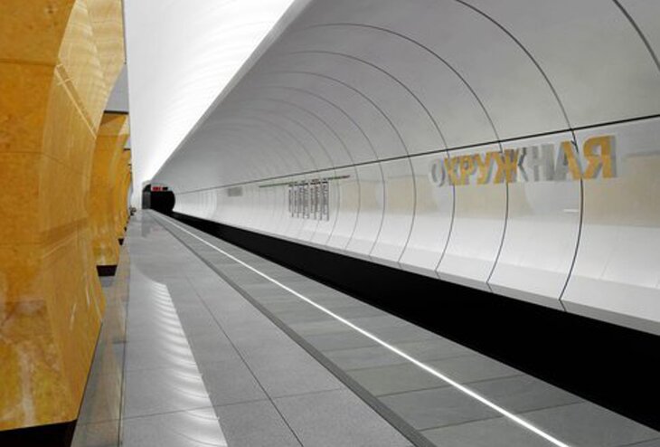 "Окружная" получила золотисто-желтые пилоны со стороны платформ. А в целом интерьер станции отсылает к Савеловской железной дороге, которая проходит поблизости. Образ железнодорожных путей создали с помощью пяти линий светильников. "Светящиеся" рельсы отражаются на своде станции и платформе. Загрузка станции в утренний час пик составит 12,6 тысячи человек, в сутки – 97 тысяч человек.