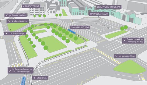 Протяженность нового разворотного кольца на площади Тверская Застава составит 1,2 километра. Также там появятся автобусные и троллейбусные остановки, которые перенесут ближе к Белорусскому вокзалу.