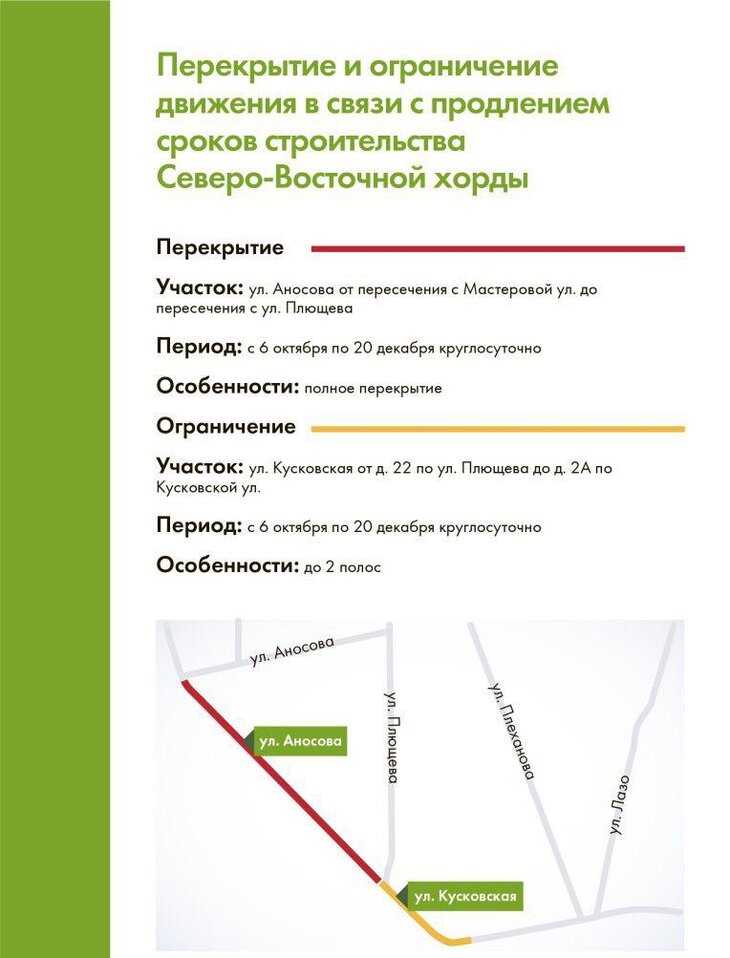 В связи со строительством участка Северо-Восточной хорды с 6 октября по 20 декабря полностью перекрыто движение участка улицы Аносова − от пересечения с Мастеровой улицей до пересечения с улицей Плющева. Также до двух полос ограничат движение на участке улицы Кусковская − от 22-го дома по улице Плющева до дома 2А по Кусковской улице.