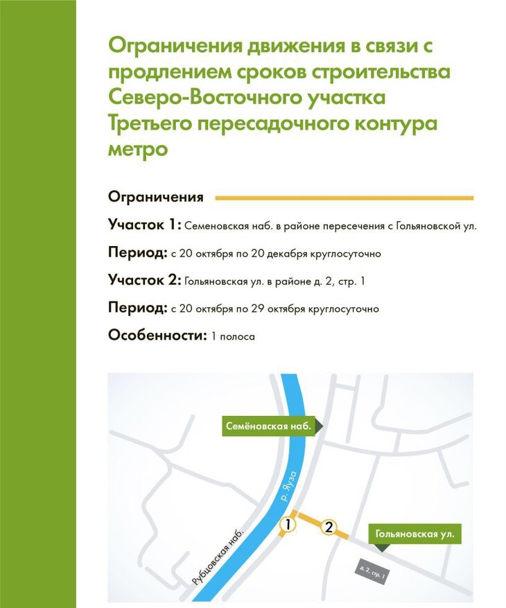 Также в центре города продолжают строить первый участок Третьего пересадочного контура (ТПК) метро − от "Хорошевской" до "Петровского парка". В связи с этим с 20 октября по 20 декабря ограничили движение на Семеновской набережной в районе пересечения с улицей Гольяновской. Также на Гольяновской, в районе дома № 2, стр. 1, ограничат движение по одной полосе.