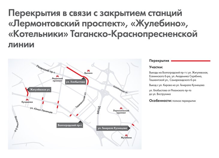В связи с закрытием трех станций Таганско-Краснопресненской линии метро ("Лермонтовский проспект", "Жулебино" и "Котельники") для автобусов, которые будут перевозить пассажиров до метро "Выхино" и "Кузьминки", откроют обособленные временные выделенные полосы. По ним же пройдут городские и областные маршруты. Доступ остальным видам транспорта на выделенные полосы будет закрыт.
