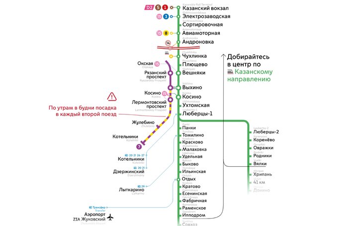 На Некрасовской линии поезда не будут останавливаться на станции "Косино" при движении в центр. Также пересадка с "Косина" на "Лермонтовский проспект" будет закрыта: перейти получится только при выходе в город. Для того чтобы доехать до "Косина", двигаясь в сторону центра, придется добираться до станции "Юго-Восточная" и пересаживаться на обратный поезд. Со станции добраться в центр можно, доехав до "Улицы Дмитриевского" и пересесть на поезд в обратном направлении.