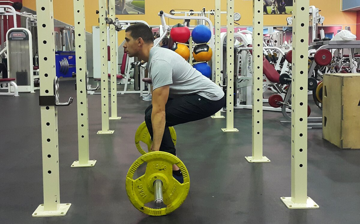 - В данной вариации, как и в румынской тяге, штангу принято брать со специальных стоек. Высота стоек должна быть такой, чтобы вы могли взять штангу, слегка подсев, что снизит риск получения травмы, если стойки расположены слишком высоко.