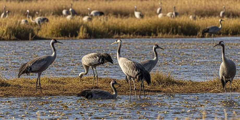В марте-апреле журавлей здесь особенно много – они прилетают гнездиться, и весь апрель заказник проводит экскурсии для желающих за этим понаблюдать. Сначала туристам прочитают лекцию о перелетных птицах, следом раздадут и настроят бинокли, а потом все отправятся на своих машинах за экскурсоводом к местам скопления журавлей.