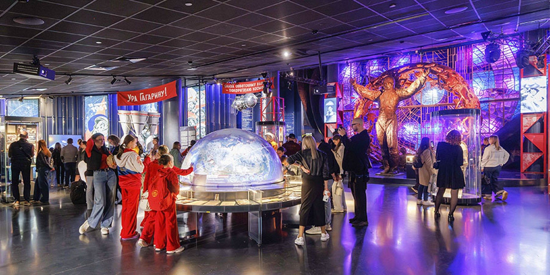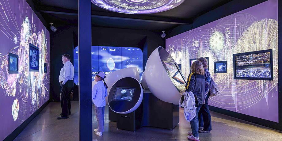 Кроме традиционных музейных экспонатов, здесь есть и интерактивные развлечения: игровые симуляторы и 5D-кинотеатр, где можно увидеть историю покорения Вселенной человеком от теории Большого взрыва до перспектив колонизации Марса.