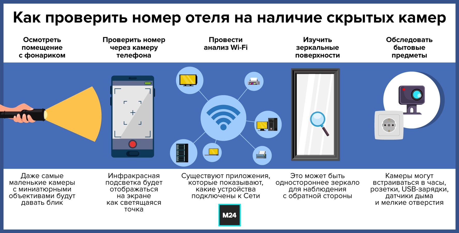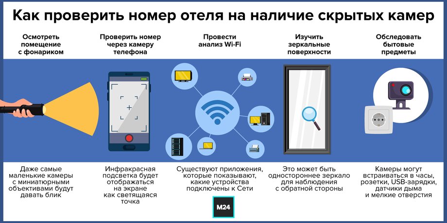 Руководитель турфирмы и тревел-блогер Наталия Ансталь в разговоре с Москвой 24 назвала способы, как обезопасить себя от подобных ситуаций и попытаться обнаружить скрытые камеры в номере. Один из них – визуальный осмотр с фонариком.