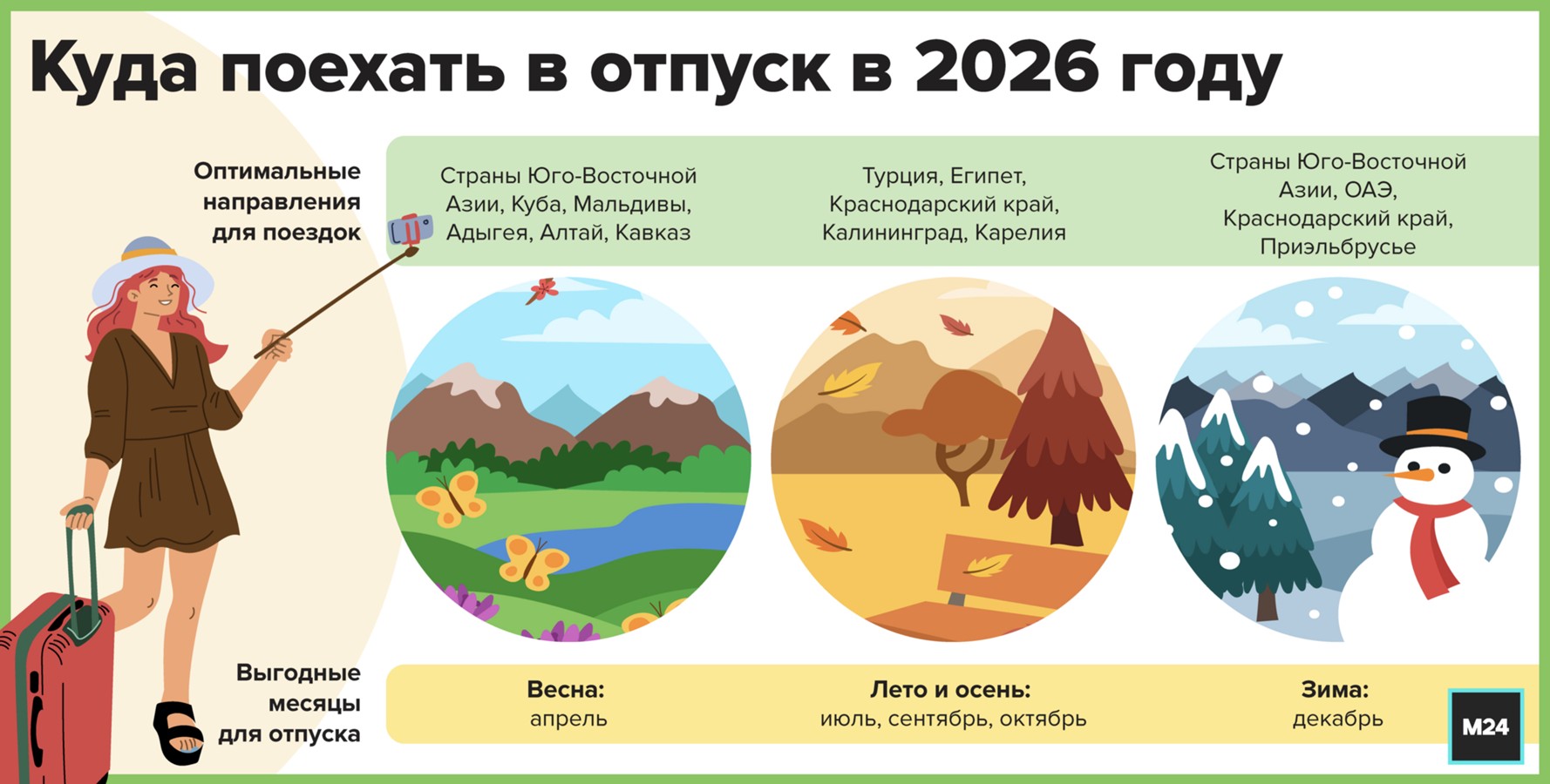 Самыми выгодными месяцами для отпуска в 2026 году эксперты назвали июль, апрель, сентябрь, октябрь и декабрь. Куда лучше отправиться на отдых и как накопить на отпуск без потерь для бюджета, разбиралась Москва 24.